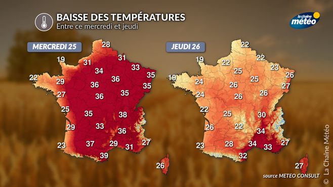 Soleil et forte chaleur dominent toujours sur une moitié est du pays tandis que dans l'ouest et surtout le nord-ouest, l'ambiance devient enfin plus respirable avec l'air océanique. Les températures baissent de 10°C parfois par rapport à la veille, retrouvant donc les normales de saison.