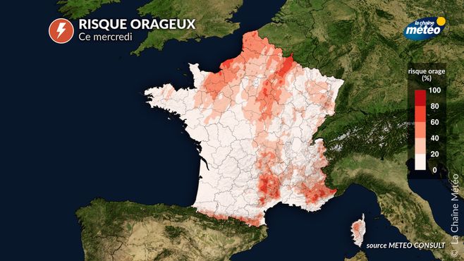 - un risque d'orages localisés en fin de journée de l'Occitanie au nord-est ainsi que sur le relief alpin.
