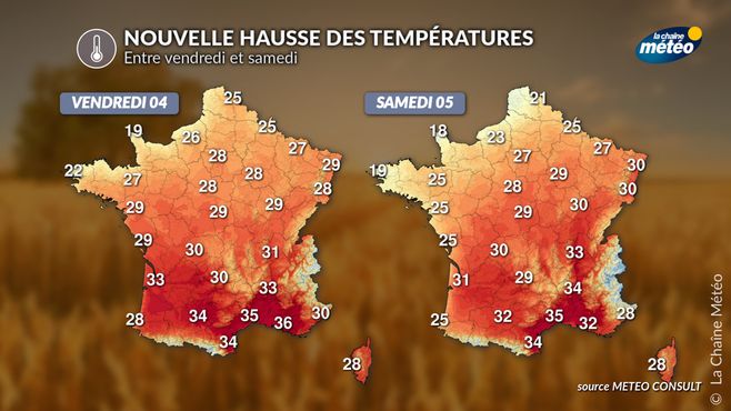 Pour autant, la chaleur reste d’actualité. Vendredi et samedi, les températures maximales resteront largement supérieures aux normales de saison, oscillant souvent entre 30 et 34°C, voire davantage localement. Ce sera particulièrement le cas dans le sud-ouest, le couloir rhodanien, l’arrière-pays méditerranéen ainsi qu’en plaine d’Alsace. Le soleil sera également très présent, contribuant à maintenir une ambiance estivale, bien que moins étouffante que ces derniers jours.