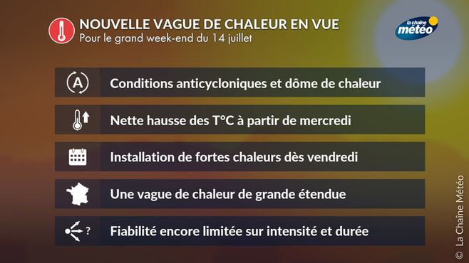 Il est encore trop tôt pour confirmer l’intensité exacte de cette nouvelle vague de chaleur. Tout dépendra de l’ampleur de la dorsale anticyclonique et la puissance de la poussée chaude qui remontera des régions tropicales vers la France. Toutefois, les tendances sont suffisamment robustes pour envisager un nouvel épisode notable, qui pourrait coïncider avec le pont du 14 juillet, qui s'annonce comme une période très chargée de départ en vacances.