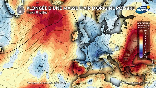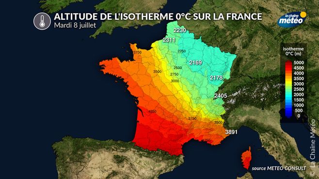 Avec la plongée d'air polaire, l'isotherme 0°C qui avait grimpé à plus de 5000 mètre d'altitude redescend vers 2000 mètres lundi et mardi dans l'est de la France. Comme cet air polaire est instable, il se traduira par de la neige sur le nord des Alpes, à Val-Thorens par exemple ! Il est à noter que la neige à 2000 mètres d'altitude dans le nord des Alpes n'a rien d'exceptionnel début juillet. C'est le passage d'une chaleur exceptionnelle à l'hiver d'une semaine à l'autre qui l'est en haute montagne !