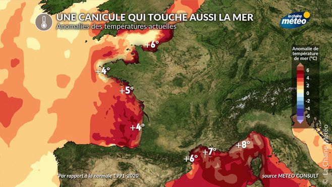 La température de la mer se situe 5°C au-dessus de la normale entre l'Atlantique et la Manche. Mais, c'est en Méditerranée que l'anomalie est la plus prononcée avec une eau entre 26 et 28°C sur la côte d'Azur, du jamais vu à la fin du mois de juin.