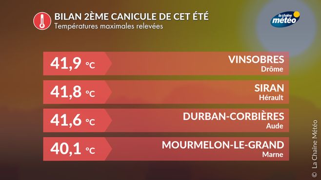 Du 26 juin au 5 juillet, les villes de Nîmes, Avignon, Carpentras et Aix-en-Provence ont connu 10 journées très forte chaleur d'affilée à plus de 35°C l'après-midi. Même si les records de chaleur de fin juin 2019 n'ont jamais été menacés (46°C à Vérargues le 28 juin 2019) , c'est en Roussillon et dans la Drôme que les températures les plus élevées ont été enregistrées. Au nord, la barre des 40°C a été atteinte à Mourmelon-le-Grand, point le plus septentrional du pays où ce seuil a été franchi.
