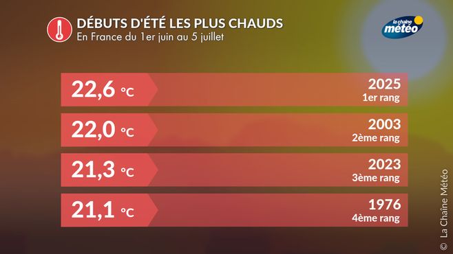 La période du 1er juin au 5 juillet 2025 a été la plus chaude jamais observée en France, devant 2003. Ce qui rend cette situation encore plus exceptionnelle est l'excédent qui atteint +0,6°C par rapport à 2003 sur la même période.