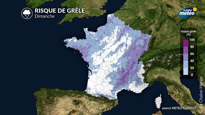 Attention aux violents orages entre le Massif central, Rhône-Alpes, Bourgogne, Jura et le Grand Est jusqu'aux Haut-de-France. De la grêle est possible, des rafales à près de 90 km/h et des pluies intenses. Dans l'ouest, nuages, éclaircies et averses alternent dans une ambiance fortement ventée en Bretagne avec des rafales à 80 km/h.