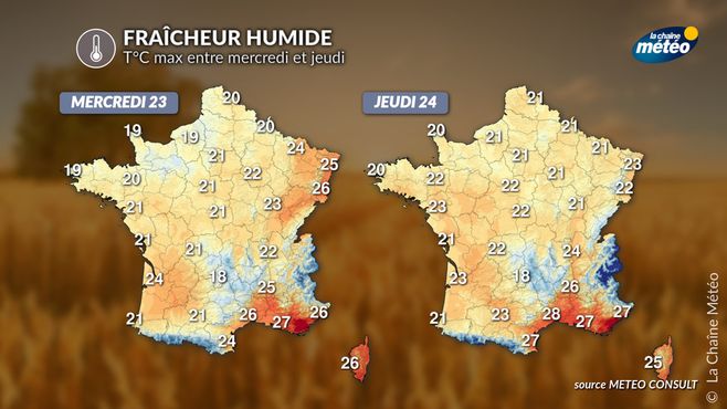 Le contraste est saisissant avec les conditions estivales persistantes des semaines passées : les températures accusent une nette baisse, jusqu’à 4 à 5°C sous les normales de saison au nord, avec des maximales parfois limitées à 18 à 22°C, sous les nuages et la pluie. L’ambiance générale évoque davantage une fin septembre qu’un cœur de juillet.