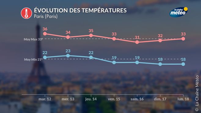 Une nouvelle vague de chaleur caniculaire s’installe sur la région parisienne cette semaine, avec des maximales attendues autour de 35°C, tandis que les nuits deviennent de plus en plus douces, voire tropicales. Ce sera la plus longue vague de chaleur de l'été pour l'instant, mais on ne devrait pas atteindre le pic de 39°C atteint début juillet dernier.
