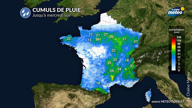 Zones où la pluie est attendue jusqu'à ce mercredi soir © La Chaine météo
