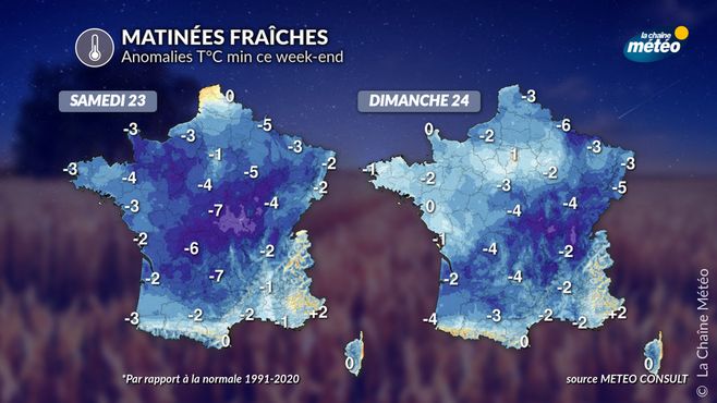 Sous un ciel dégagé et un air calme, les températures chutent au petit matin dans les plaines et vallées de l’intérieur. De nombreuses campagnes du centre et du nord affichent 7 à 9°C, parfois moins dans les fonds de vallée du Massif central. Une fraîcheur saisissante pour une fin août, mais vite compensée par un soleil généreux. Plus au sud, la douceur domine avec 16 à 19°C près de la Méditerranée.