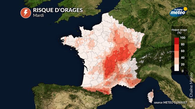 Mardi après-midi, après une journée de chaleur à plus de 30°C, les premiers orages se formeront du sud-ouest au Massif central en direction de la Bourgogne, du Jura et de l’Alsace. Ils se renforceront en soirée.