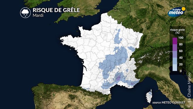 Le risque de grêle est à surveiller en Auvergne ainsi que des Cévennes à l'arrière-pays provençal jusque sur les Alpes-Maritimes, essentiellement dans la soirée et nuit de mardi à mercredi.