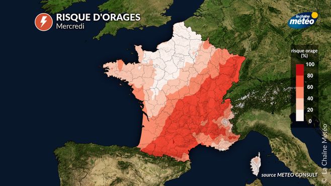 Mercredi s’annonce comme une journée agitée. Des orages ponctuellement forts concerneront une large zone allant des Pyrénées au Rhône-Alpes jusqu'en Franche-Comté et au Grand Est. Les régions méditerranéennes seront impactées, notamment le Languedoc-Roussillon.