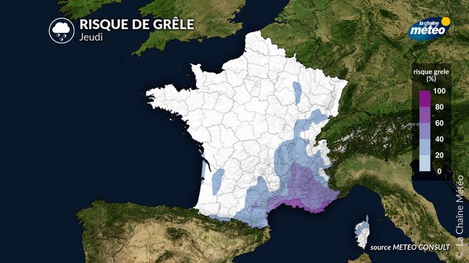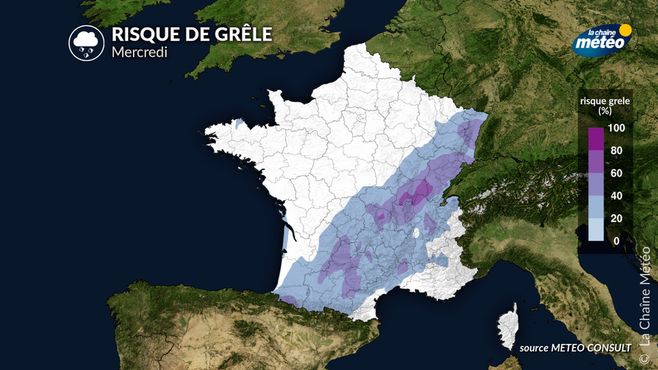 Sous les plus violents orages, des chutes de grêle sont possibles de Midi-Pyrénées au Grand Est au nord de Rhône-Alpes en passant par le Massif central principalement.