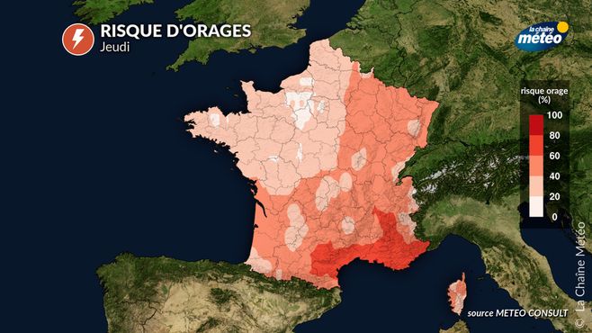Jeudi, la perturbation gagnera l’est et le sud du pays. L’activité orageuse s’annonce forte du côté de Rhône-Alpes et de la Bourgogne-Franche-Comté, voire intense sur les régions méditerranéennes : un épisode méditerranéen y est envisagé.