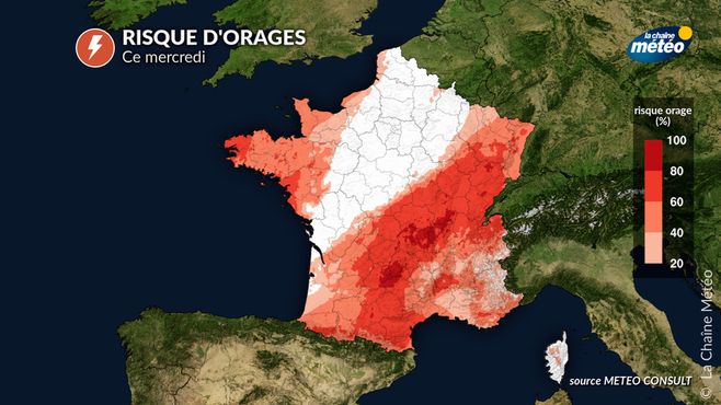 L’instabilité se renforce dans le sud et dans l'est avec des orages violents attendus du nord de l'Occitanie à l'Auvergne et la Bourgogne-Franche-Comté. Des orages parfois forts concernent aussi la Lorraine et l'Alsace. Sous les cellules orageuses les plus actives, on attend des chutes de grêle, de violentes rafales de vent (80-100 km/h) et des pluies intenses (localement plus de 50 mm en peu de temps). Un temps sec se maintient des Charentes et des Pays de la Loire à la frontière belge en passant par le Bassin parisien. Une perturbation active traverse la Bretagne et le Cotentin avec des fortes pluies prenant parfois un caractère orageux.