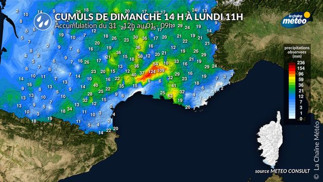 Cumuls entre dimanche 14 H et ce lundi à 11H © La Chaine Météo