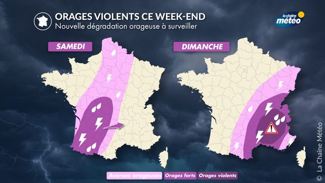 À l'avant d'un front froid situé sur le proche Atlantique, de l'air plus instable circulera dès samedi dans le nord-ouest avec quelques averses orageuses attendues en cours de journée. Elles circuleront rapidement et ne devraient apporter que d'assez faibles cumuls de pluie. C'est en soirée qu'une dégradation orageuse plus marquée débutera par l'Aquitaine avec des orages accompagnés de pluies intenses remontant d'Espagne sur le sud de l'Aquitaine ; ils remonteront en cours de nuit en direction du Massif central.
