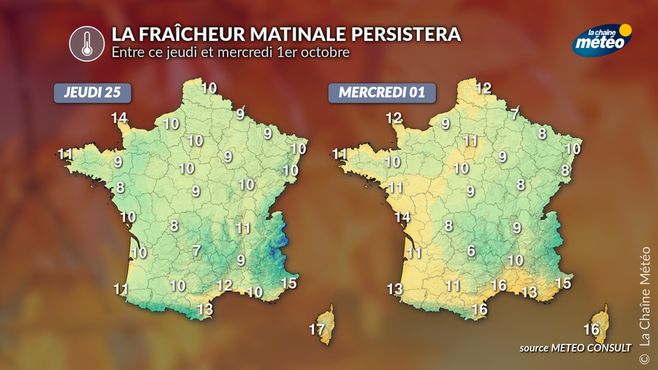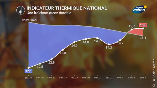 La masse d'air restera assez fraiche sur notre pays, venant de l'est à nord-est. Cet air continental favorisera des amplitudes thermiques assez marquées : des matins frais, parfois proches de 0 à 3 °C dans les zones les plus exposées, avec un risque de petites gelées précoces, tandis que les après-midi seront à peu près de saison, entre 14 et 18 °C, voire 19 °C dans le sud. Les brouillards matinaux seront fréquents, surtout en plaine et vallées, et pourront parfois être tenaces. En cas de brouillards durables, les températures diurnes pourraient plafonner autour de 10°C, ce qui est fréquent à cette époque de l'année avec un anticyclone.