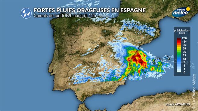 La dépression orageuse peu mobile entre lundi et mardi est à l'origine de cellules orageuses très pluvieuses pouvant stationner au même endroit pendant plusieurs heures. Les cumuls de pluie pourraient atteindre 200 mm sur certains secteurs, sous les orages les plus actifs. Les provinces les plus touchées par les fortes pluies orageuses sont Valence, Castellón et Tarragone. L’agence météorologique espagnole (AEMET) a émis une alerte rouge pour fortes pluies dans ces zones.