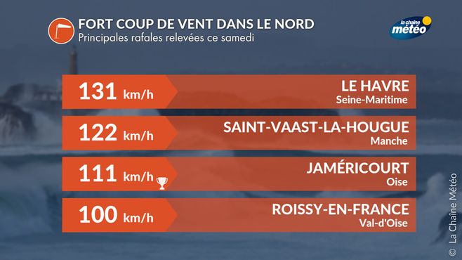 La combinaison de ces facteurs a provoqué ce samedi des rafales d'une puissance remarquable entre la Normandie, les Hauts-de-France et le nord de l’Île-de-France. Au Havre, le vent a atteint 131 km/h et 122 km/h à Saint-Vaast-la-Hougue et à Fécamp. Dans les terres, le vent a atteint 111 km/h à Jaméricourt établissant un record mensuel, 109 km/h à Rouen, 105 km/h à Plessis-Belleville, 101 km/h à Pontoise et 100 km/h à Roissy et Cambrai.