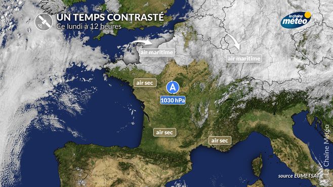 L’anticyclone, centré sur la France, bloque l’arrivée de perturbations atlantiques et préserve un ciel plutôt sec. On attend donc un temps calme avec des éclaircies dominantes, notamment à partir de mardi, sur une bonne partie du pays. Toutefois, dans les régions du nord-est ou à l’intérieur des terres, des nuages bas ou brouillards matinaux pourraient s’inviter et résister en journée. A la faveur de l'ensoleillement, les températures remonteront : les après-midi deviendront agréables, mais les nuits resteront fraiches en raison du rayonnement.