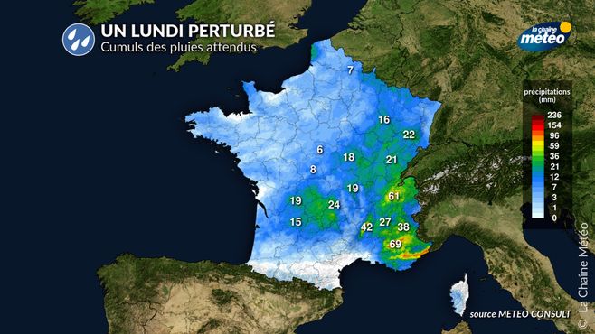 Les pluies se poursuivent du Massif central aux frontières de l'est. Elles sont soutenues, ponctuellement orageuses en Rhône-Alpes. Les précipitations les plus fortes se produisent entre les Cévennes et la Provence Côte d'Azur, avec des risques de ruissellements urbains, voire d'inondations ponctuelles. Dans l'ouest, le temps est instable avec des averses et du vent fort en Manche et près de l'Atlantique à 80-90km/h.