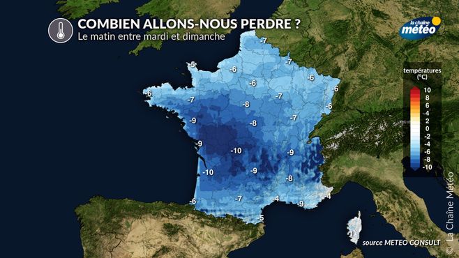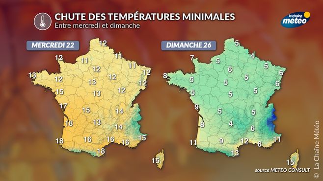 Dès vendredi, la baisse des températures sera nette. Après plusieurs jours doux pour la saison, le thermomètre perdra entre 4 et 6°C en moyenne, et même davantage sur le centre-ouest. Les maximales peineront à dépasser 12 à 15°C au nord et 16 à 18°C au sud, tandis que les minimales, en nette baisse, redescendront autour de 4 à 7°C dans les plaines du nord et 8 à 10°C dans le sud-ouest.