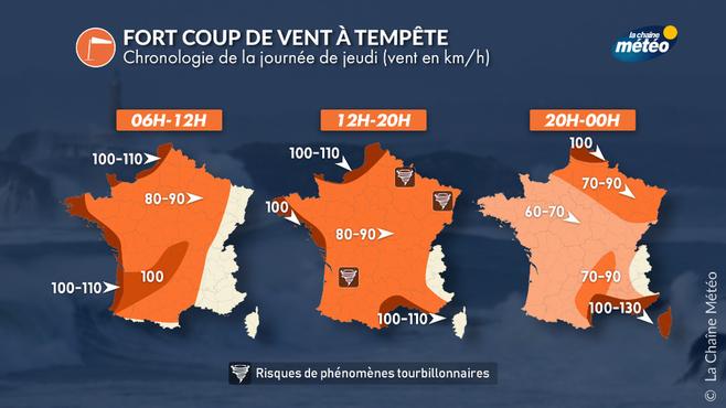 Le renforcement du vent débutera dès la fin de nuit de mercredi à jeudi sur la façade atlantique, notamment entre la Bretagne et la Gironde, ainsi que le long des côtes de la Manche. Le pic de l’épisode est attendu dans la matinée, entre 6 h et 12 h, lorsque le front pluvieux et orageux balayera les deux tiers ouest du pays. En milieu de journée, les rafales les plus fortes se décaleront vers le centre, la vallée de la Loire et le nord-est, avant qu'un déferlement de vent ne se mette en place en cours d'après-midi et le soir près de la Méditerranée puis la Corse, avec là aussi localement des rafales tempétueuses.