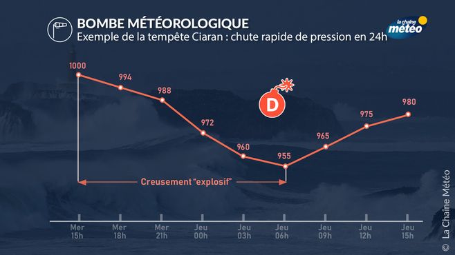 Le terme de bombe météorologique, ou cyclogenèse explosive, désigne une dépression dont la pression atmosphérique chute d’au moins 24 hPa en 24 heures à des latitudes tempérées. Cette baisse rapide traduit une intensification brutale du système dépressionnaire, un peu comme une explosion sur le plan dynamique.