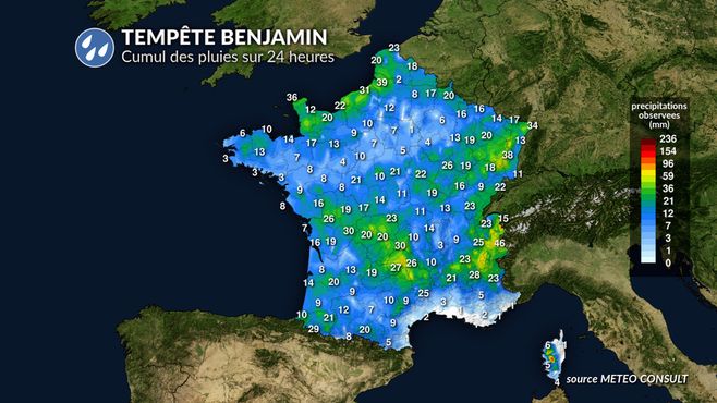 Au passage de la perturbation, les pluies ont été abondantes du sud-ouest au Centre Est. Par endroit, il est tombé l'équivalent de 2 semaines de pluies d'un mois d'octobre (57 mm à Châtel), jusqu'à 1 mois à Bocognano (144 mm) en Corse.
