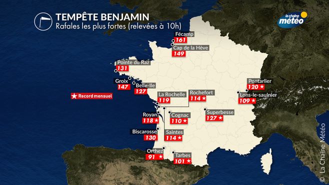 Quelques valeurs maximales de vent liées à la tempête Benjamin © La Chaîne Météo