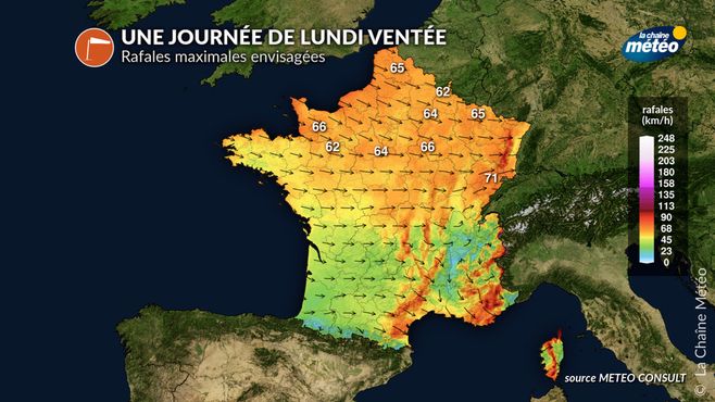 Ce lundi, une perturbation descendant des îles Britanniques traverse les ¾ du pays. Elle apporte pluies, averses et vents assez forts sur une bonne partie du territoire.