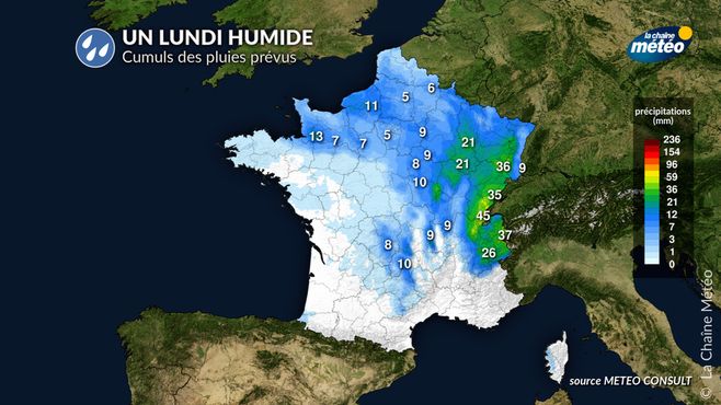 Du nord de la Seine aux frontières de l'Est à l'Auvergne Rhône-Alpes, le temps est agité avec des pluies marquées des Vosges aux Savoies et de la neige à partir de 1000 mètres sous de fortes rafales. Dans l'ouest, le temps est menaçant avec quelques averses. Près de la Méditerranée, le vent souffle fort ainsi qu'en Corse sous un ciel passagèrement nuageux.