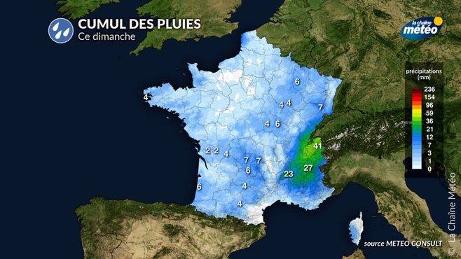 Il continue de pleuvoir à l'est du Rhône et de la Saône avec de la neige dès 1600 mètres, en abondance dans les stations. Des averses orageuses circulent en Provence-Côte d'Azur et en Corse alors que des éclaircies reviennent en Languedoc-Roussillon aidées par la levée de la tramontane. Des Pyrénées au Grand en passant par le val de Loire, le bassin parisien et les Hauts-de-France, les averses du début d'après-midi, parfois musclées, faiblissent. Au nord-ouest, les éclaircies s'élargissent au fil des heures sous un vent sensible.