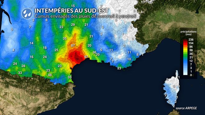 La situation est assez calée concernant ce risque d'intempéries. Ce qui est moins sûr, ce sont les cumuls de pluie modélisés sur la période. Une zone à risque ressort tout de même sur l'ensemble des modélisations : le Languedoc. La Provence-Alpes-Côte d'Azur et dans une moindre mesure le Roussillon semblent rester à l'écart pour le moment.