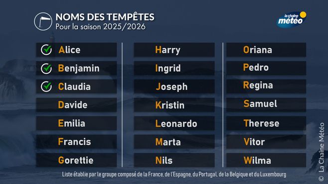 Pour notre zone européenne, c’est le groupe « Sud-Ouest » (Espagne, Portugal, France, Belgique, Luxembourg, Andorre) qui établit la liste officielle des noms des tempêtes pour la saison 2025-2026 ouverte le 1er septembre. Cette liste est commune à tous ces pays, et un même nom est utilisé dès lors qu’une dépression nécessite au moins une alerte vent/pluie de niveau orange sur l’un d’entre eux.