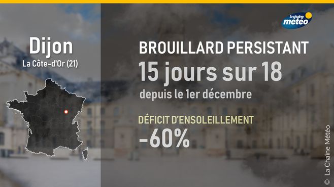 La ville de Dijon, située dans la vallée de l'Ouche et la plaine de la Saône, est réputée pour ses grisailles tenaces en fin d'automne et en hiver. Ce mois de décembre en est la parfaite illustration puisque la station météo de Dijon-Longvic a observé 15 journées sur 18 avec brouillard et seulement 11 heures d'ensoleillement depuis le 1er décembre. Le déficit d'ensoleillement atteint 60% sur la période allant du 1er au 18 décembre. Et la situation n'est pas propice eux belles journées ensoleillées pour ces prochains jours.