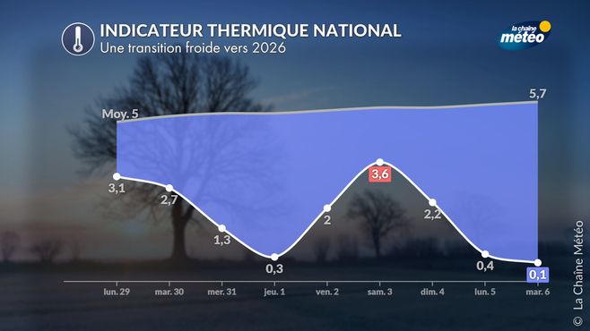 Cet épisode de froid s’explique par l’installation d’un vaste anticyclone sur l’Europe du Nord, imposant un flux continental d’est à nord-est sur la France. L’air froid et sec, peu brassé, favorise de fortes gelées nocturnes sous ciel souvent dégagé (rayonnement nocturne). Ces derniers matins, les températures sont fréquemment descendues entre -5 et -8 °C sur le nord et le centre, avec localement jusqu’à -10 °C dans le nord-est. L’indicateur thermique national s’inscrit nettement sous les normales de saison (-1 à -3 °C selon les régions), sans toutefois atteindre les seuils d’une vague de froid (*). Après le Noël le plus froid depuis 2010, la France se dirige vers un réveillon de la Saint-Sylvestre tout aussi froid, avec brouillards givrants et un indicateur thermique prévisionnel proche de +0,3 °C, comparable à la fin 2016.