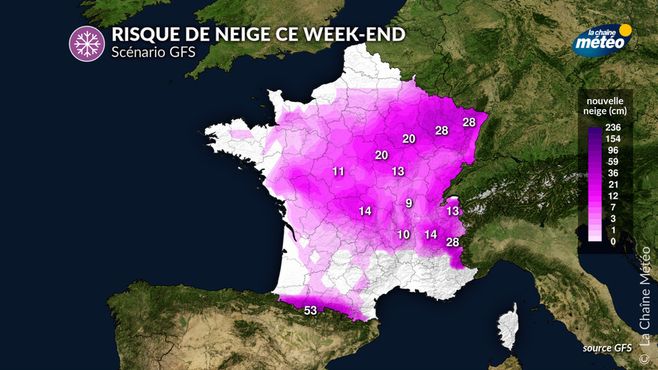 Le modèle américain GFS envisage un scénario nettement plus actif, avec des chutes de neige plus généralisées entre l’Île-de-France et le nord-est, pouvant constituer un épisode notable en plaine.
