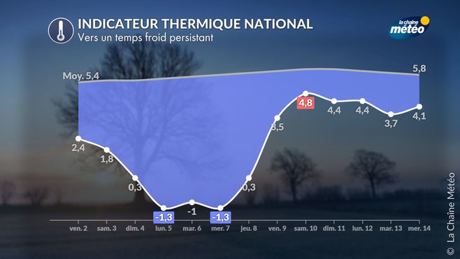 Entre dimanche et mercredi, c’est l’ensemble de la France qui sera concerné par des températures nettement inférieures aux normales de saison. L’indicateur thermique national oscillera entre -0,3 et -1,3 °C, soit 5 à 6 °C en dessous des valeurs habituelles.