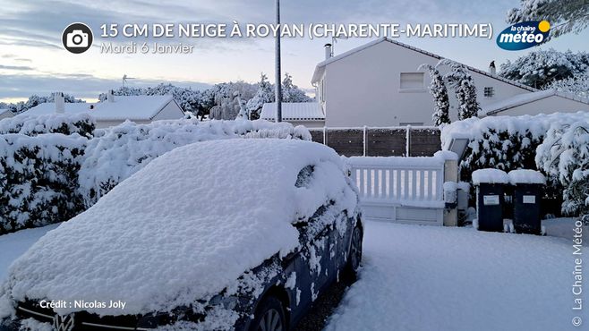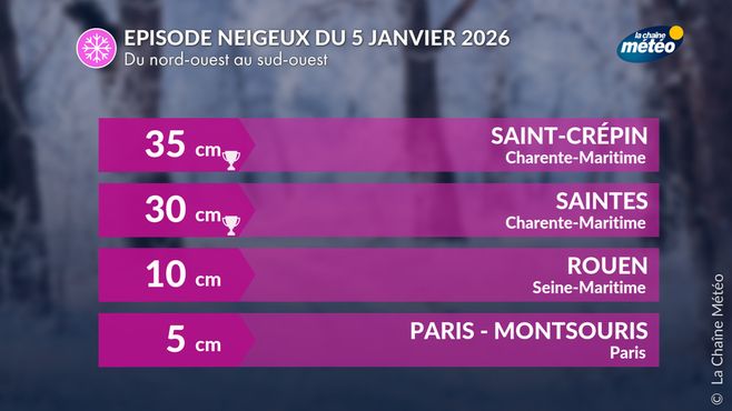 La neige a d’abord concerné lundi un large quart nord-ouest jusqu’à l’Île-de-France, où l’on a généralement relevé 2 à 6 cm, suffisants pour provoquer de fortes difficultés de circulation. En Normandie, les cumuls ont souvent atteint 3 à 7 cm (jusqu’à 10 cm sur les hauteurs), tandis que Bretagne intérieure et Pays de Loire ont fréquemment observé 5 à 10 cm. L’événement le plus marquant s’est produit plus au sud, vers la Vendée et surtout les Charentes : en Charente-Maritime, des épaisseurs de 25 à plus de 30 cm ont été signalées, avec des pointes proches de 30 cm autour de Saintes. Un enneigement de cette ampleur, en plaine et près du littoral, reste rare et souligne le caractère remarquable de cet épisode.