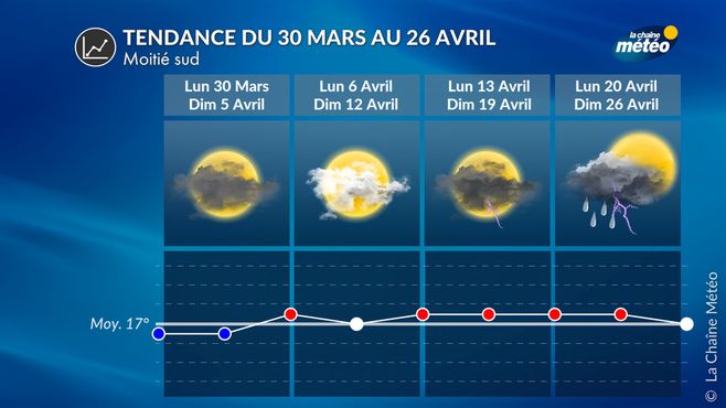 Pour la fin du mois de mars et le week-end de Pâques, la situation s'annonce plus anticyclonique, avec un temps calme et sec qui devrait progressivement s'imposer. C'est dans ces mêmes conditions que le mois d'avril devrait se poursuivre.