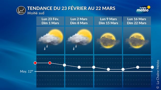 Les scénarios divergent pour début mars, mais des perturbations devraient encore se succéder, surtout au nord du pays. Le sud-est pourrait rester à l'écart de l'agitation grâce à l'anticyclone qui se situerait plus au sud, vers la péninsule ibérique et le nord du Maghreb. Les températures pourraient baisser, pour revenir proches des normales.