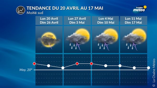 Pour la fin du mois d'avril, le temps reste globalement calme et sec, avec des températures plus fraîches au nord. Néanmoins, une tendance orageuse commence à se dessiner au sud, avant la généralisation de ce temps agité et instable pour le début du mois de mai sur le pays.