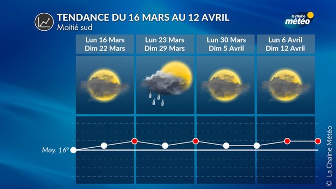 Grâce à l'anticyclone, le temps calme et sec sera d'actualité pour la semaine du 16 mars. Malgré tout, de nouvelles dépressions pourraient se former en Méditerranée, avec le retour d'un temps perturbé fin mars. Le temps calme et sec pourrait faire son retour autour du week-end de Pâques, avec un risque de gel tardif à surveiller.
