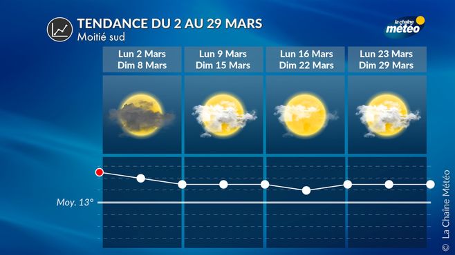 Pour le début du mois de mars, l'anticyclone va continuer de régner en France, avec un temps qui devrait être calme et sec, bien ensoleillé au nord. Une dépression devrait se former au nord du Maghreb et sur la péninsule Ibérique, ce qui pourrait amener un temps plus nuageux, avec le passage de possibles perturbations dans le sud. Les températures resteront au-dessus des normales de saison.