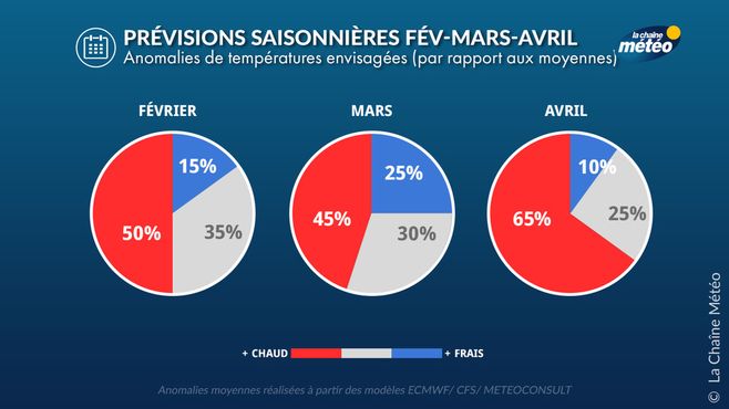 Nos prévisions saisonnières vous proposent le scénario prédominant pour la fin de l'hiver et le début du printemps en France métropolitaine. La fiabilité est plutôt bonne pour les températures avec un hiver globalement doux, mais avec des incursions d'air froid parfois marquées comme début janvier. La fiabilité est plus limitée concernant les précipitations. La plus grande probabilité tend vers une pluviométrie diminuant en fin d'hiver.