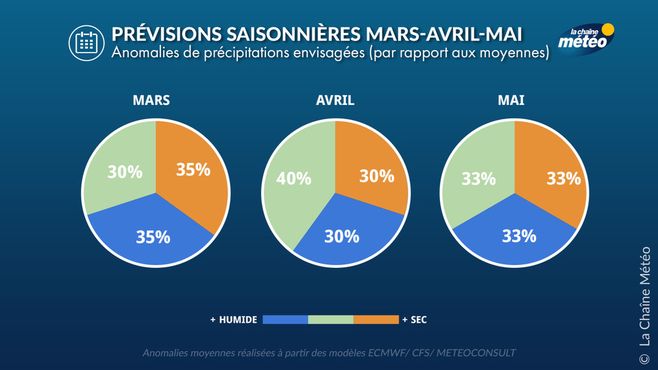 Précipitations : tendance proche des normales à l’échelle nationale, légèrement déficitaire, avec des contrastes possibles, plus sec au nord lors des phases anticycloniques, et un peu plus humide vers le sud dans les scénarios où les dépressions circulent bas en latitude. Une situation de marais barométrique avec les premières ondées orageuses semble possible. L'anomalie serait de -10% avec une fiabilité limitée.