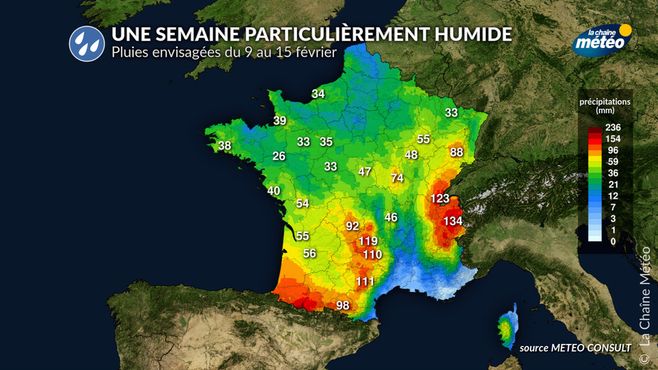 Pluies et vent se généralisent à l’ensemble du pays. Les précipitations sont particulièrement soutenues dans le sud-ouest. En montagne, la neige tombe seulement en altitude, au-dessus de 1 800 mètres. Près de la Méditerranée, le ciel devient menaçant. En raison du vent de sud, il fait doux, autour de 13°C au nord et 15°C au sud, mais le ressenti est peu agréable.