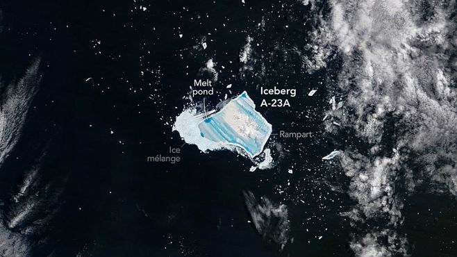 L'iceberg A23a vu du satellite avec ses zones bleues bien distinctes © Nasa
